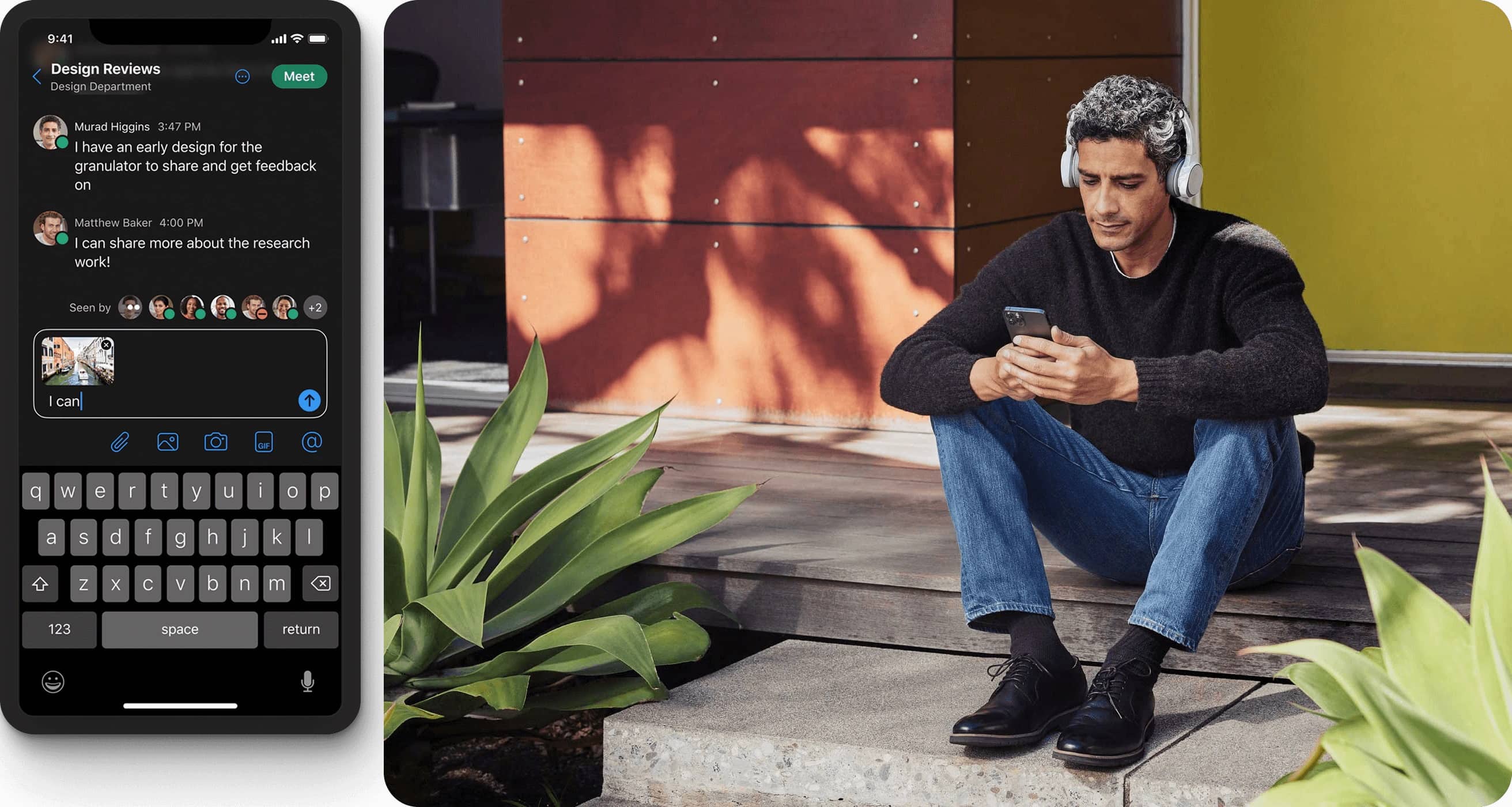 “不在办公室”并不意味着无法联系。查看用户是否有空并与个人或小组聊天。通过语音、高清视频、会议和桌面共享进行更深入的对话。